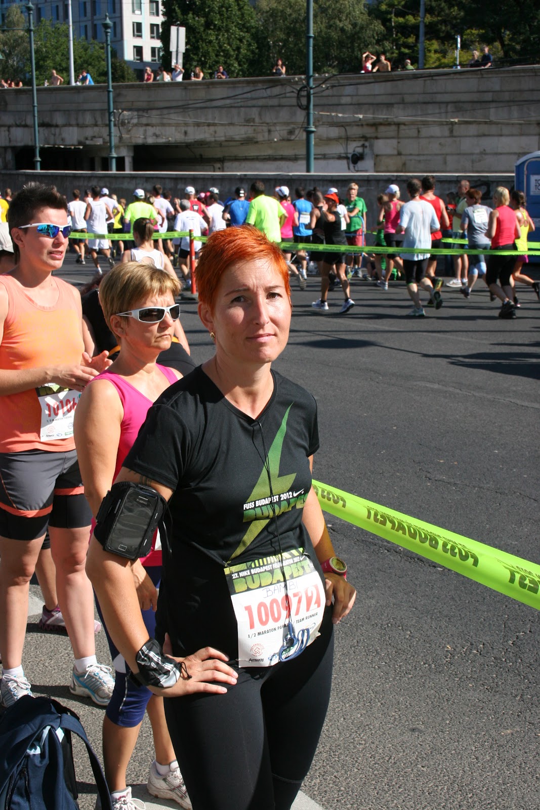 Szaladtak a percek, azt vettük észre, hogy mindjárt start, úgyhogy elindultunk, hogy útnak engedjük Bogit. :) Rengetegen voltak, Bogit is egy pillanat alatt elveszítettük szem elől, úgyhogy előre sétáltunk egy darabot és onnan figyeltük a mezőnyt a start után és próbáltuk kiszúrni a társamat. :))) Mivel fehér baseball sapka volt rajta, így a helyzetet nem könnyítette meg, mivel minden második futón fehér színű sapi volt. :D :D Végül azért sikerült elcsípnünk, Ádi mellett startolt, aki DK tag és előző nap a 12 órás balatonalmádi ultrafutáson futott 97 km-t, de tegnap még eljött lenyomni egy "laza félmaratont". :)))
